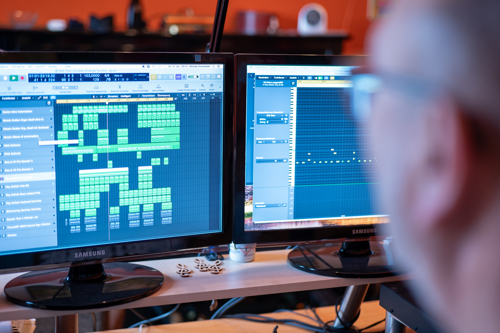 Mein Equipment besteht aus einem Power-Mac mit 2 Bildschirmen. Als Software verwende ich Logic Pro X mit diversen PlugIns u.a. von Native Instruments, East West Soundsonline, UVI, Best Service und IK Multimedia. Neben mehreren Mikrofonen verwende ich hauptsächlich ein Neumann U 87i, ein StudioLogic Masterkeyboard und ein Focusrite Audio-Interface.